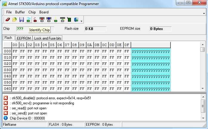 viele rote Kreuze zeigen und Fehlermeldungen wie "stk500: programmer is not